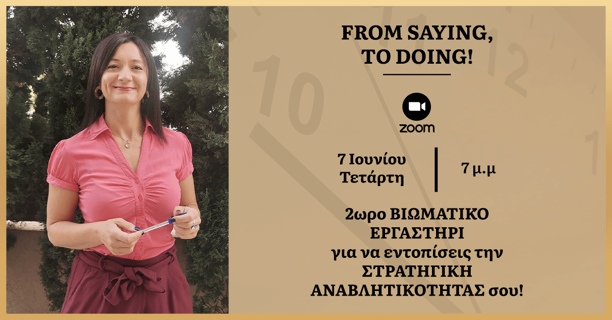 Το βιωματικό εργαστήρι From SAYING to DOING! , είναι ένα 2ώρο εργαστήρι το οποίο έρχεται να σε βοηθήσει ΝΑ ΑΝΑΚΑΛΥΨΕΙΣ με ποιο τρόπο και με ΠΟΙΑ ΣΤΡΑΤΗΓΙΚΗ ΑΝΑΒΑΛΛΕΙΣ να κάνεις αυτά που είναι σημαντικά για σένα. Γιατί το κλειδί είναι, να συνειδητοποιήσεις ότι εσύ ο ίδιος σταματάς τον εαυτό σου. Τότε και μόνο θα μπορέσεις να πάρεις την απόφαση να σταματήσεις να τον σταματάς.